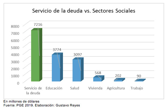 La relación del servicio de la deuda externa con el sector social, aún sigue siendo bastante desproporcionada, es decir que, lo que se tiene que destinar al pago de la deuda externa es mucho más significativo versus los gastos y programas sociales presupuestados para el año 2019, como se evidencia en el cuadro adjunto: