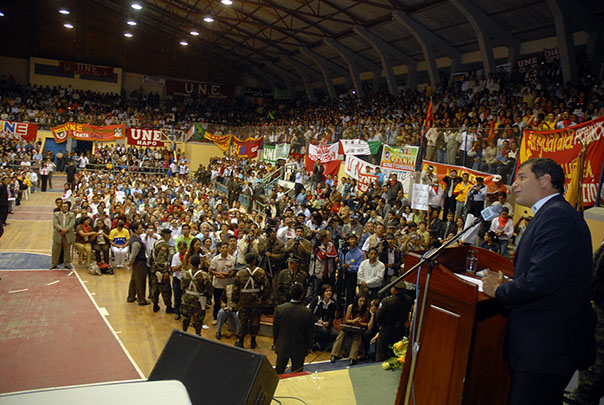 No nos llamemos a engaño. La guerra emprendida por Correa contra la UNE tiene un trasfondo muy claro y preciso: descuartizar a la izquierda revolucionaria, entendida la UNE como la expresión social clasista de mayor envergadura, cuya incidencia en un ámbito de tanta trascendencia como es la educación, debe cortarse de raíz para dar cabida a la “Sociedad del Conocimiento”, es decir, a la sociedad del sometimiento a los negocios grandes, de las trasnacionales, de la producción extractivista minera. Para eso hay que eliminar a los revolucionarios pues su “izquierdismo infantil” no les permite comprender la nueva marcha de la historia universal. Los jóvenes, los educandos, deben concentrar su actuación en la competencia por las becas para irse del Ecuador ya que las universidades públicas ecuatorianas son, como dijera el inefable León Febres Cordero, maestro de Alexis Mera, madriguera de revolucionarios.
