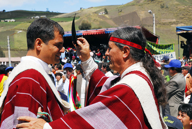 El correato logró apoderase del inconsciente colectivo de las masas en la posesión simbólica en Zumbahua, provincia de Cotopaxi, donde durante su juventud hizo trabajo voluntario y a la que volvía después de tantos años como Presidente de la República. En esa localidad andina se realizó un ritual indígena con los taitas y mamas. César Umaginga, por entonces prefecto de la provincia, le hizo la entrega del bastón de mando que para los pueblos y nacionalidades representa el poder del gobernante de un pueblo. Fue ungido el nuevo salvador de la Patria, el tesorito de la revolución ciudadana, en compañía de Hugo Chávez el líder de la revolución ciudadana y Evo Morales primer presidente indígena elegido en Bolivia. Es en este rito que ese imaginario romántico de Simón Bolívar y de muchos grupos de izquierda: “Latinoamérica la Patria grande”, se reactualizaba. Allí ocurre también la primera apropiación de los símbolos, frases y consignas de la izquierda revolucionaria: “Alerta, alerta que camina el antiimperialismo por América Latina”, una consigna que había sido bandera de lucha en contra del Área de Libre Comercio de las Américas (ALCA) y el Tratado de Libre Comercio (TLC) con los EEUU. La viveza criolla del correato lo transformó en “Alerta, alerta que camina la espada de Bolívar por América Latina”.