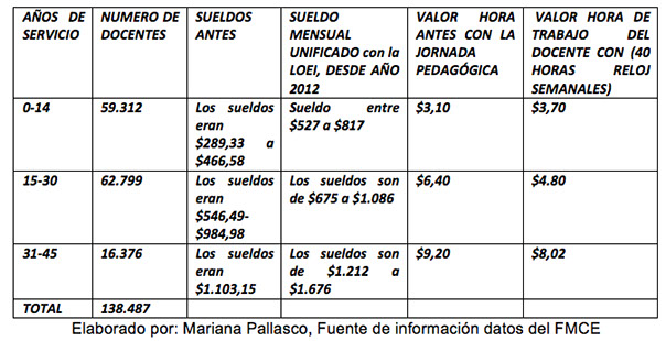 Es decir el maestro (a) tendrá que esperar cuatro años para que se cumpla con su derecho a una re categorización justa, revalorización de su profesión y labor docente, además de ser perjudicado en su sueldo ya que su incremento real al salario será anual un promedio de 70 a 80 dólares también se incrementa su aporte personal al IESS.