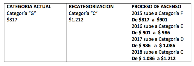 Docente que en el proceso de homologación fue ubicado por su total de ingresos en la Categoría “G”, $775 (2011) subió a $817 (2012), sus 20 años de servicios, titulo docente, evaluación y capacitación no fueron reconocidos. En octubre del 2014 se presenta a la re categorización y aprueba a categoría C $1.212.